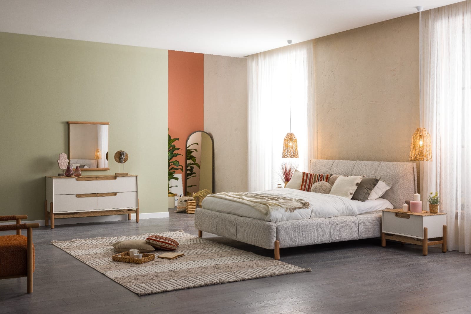YATAK ODASI TAKIMI: Karyola, karyola başucu, 2 adet komodin, gardorop, şifonyer, şifonyer aynasından oluşmaktadır.