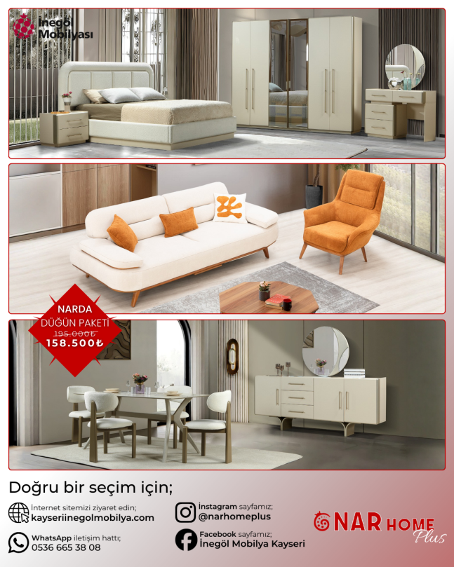YATAK ODASI TAKIMI: Karyola, karyola başlığı, 2 adet komodin, gardırop, şifonyer ve şifonyer aynasından oluşmaktadır.