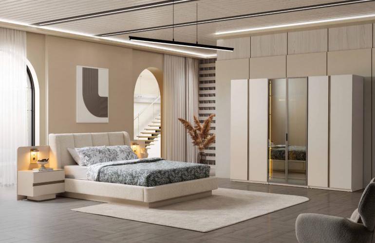 YATAK ODASI TAKIMI: Karyola, karyola başucu, 2 adet komodin, gardorop, şifonyer, şifonyer aynasından oluşmaktadır.